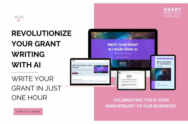 Celebrate our 8-year business anniversary with us. Register now for the “Write Your Grant in One Hour Using AI” course at an $80 discount and reclaim hundreds of hours from your grant writing tasks.